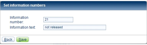 Set information numbersIn the order line window in the order book select one or more order lines. On the Edit menu select the Set information numbers command. Accept your entry by clicking OK. Related subjects: