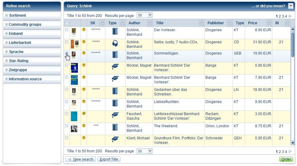 Titles found in the new searchThe title window shows all titles that have been found with the new search. You can refine or correct the search. You can order titles directly or first open the full-screen view for a title. You can see how many titles have been found at the top and bottom left on the title window. Using the list box you can select how many titles are displayed on a page.