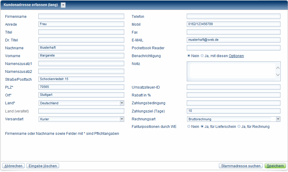 Nun können Sie die Adresse ändern oder zusätzliche Angaben zum Beispiel zur automatischen Benachrichtigung, zum automatischen Bereitstellen von Fakturpositionen oder zur Rechnungsart eintragen. Auch die für die Ebook-Funktion Send-to-Pocketbook benötigte Email-Adresse eines Pocketbook-Readers lässt sich (unter Pocketbook Reader) dauerhaft in den Kunden-Stammdaten speichern