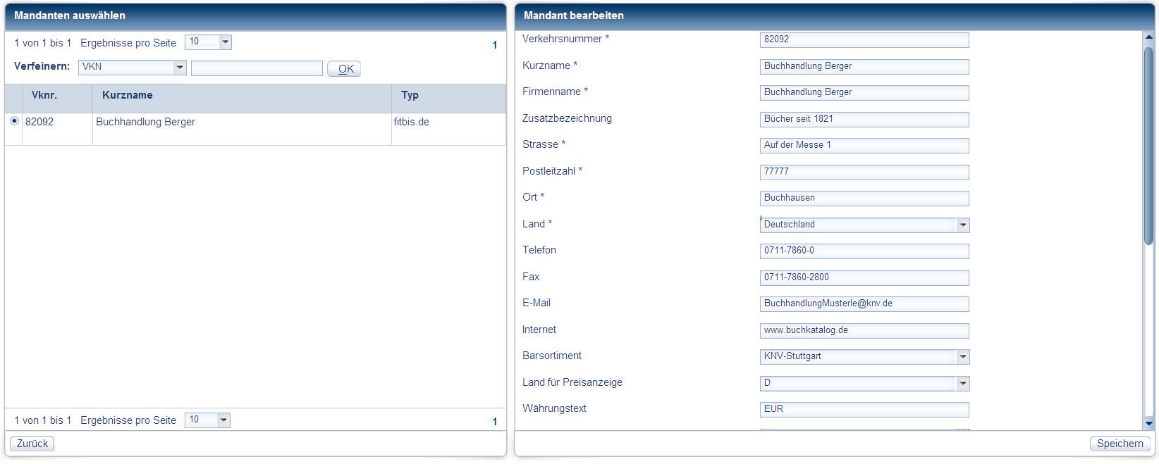 The existing clients with ID number (Vknr. [ID no.] column) are displayed on the left in Mandanten auswählen [Select clients] and on the right in Mandanten bearbeiten [Edit clients] the data for the selected client. Fields marked with * are mandatory and must be completed. Data on your bookshopIn the Kurzname [Short name] field enter the name that is to appear in the client selection. In the Firmenname [Company name] field enter the name of your bookshop and in the Zusatzbezeichnung [Additional identifier] field any additional identifier. In the fields that follow enter the street with house number, the postcode and the town for your bookshop. In the Land [Country ] field select your country. Complete, if available the Telefon [Telephone], Fax, E-Mail [E-mail] and Internet fields. Complete the fields carefully, the name of the bookshop and the additional identifier will be printed out on the order slips and the literature lists. Settings for pcbis.de/fitbis.deIn the Barsortiment [Wholesaler] field select whether KNV Cologne or KNV Stuttgart is to be used as the wholesaler. In the Land für Preisanzeige [Country for price information] field is displayed: