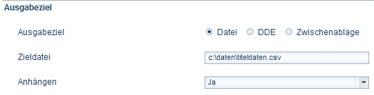 Format, and destination for the title exportYou can export title data from the title window, the memory list or a saved list for external programs such as ERP systems. Export presettings for title dataOn the Mandanten (Clients) menu select the Titelexport [Title export] command. In the Exportformat [Export format] field select the required format. Select Yes in the Zusatztext [Additional text] field if the additional text is also to be exported. Selection of the destination for the exportIf you want to save the data to a file, select the related field. Enter a path and file name in the Zieldatei [Target file] field. This path and file name is then used as the default on export to a file. In the Anhängen [Append] field select the Yes option if you want to append the data to an existing export file and as a result an existing file is not overwritten. If you want to export the files to a DDE program, select the related field. DDE = Dynamic Data Exchange. This is a protocol for the exchange of data between different applications. Enter the related parameters for the title export in the DDE Server to DDE Item fields. If you want to export the data to the Clipboard, select the related field. To save the settings, click Save. Related subjects: |