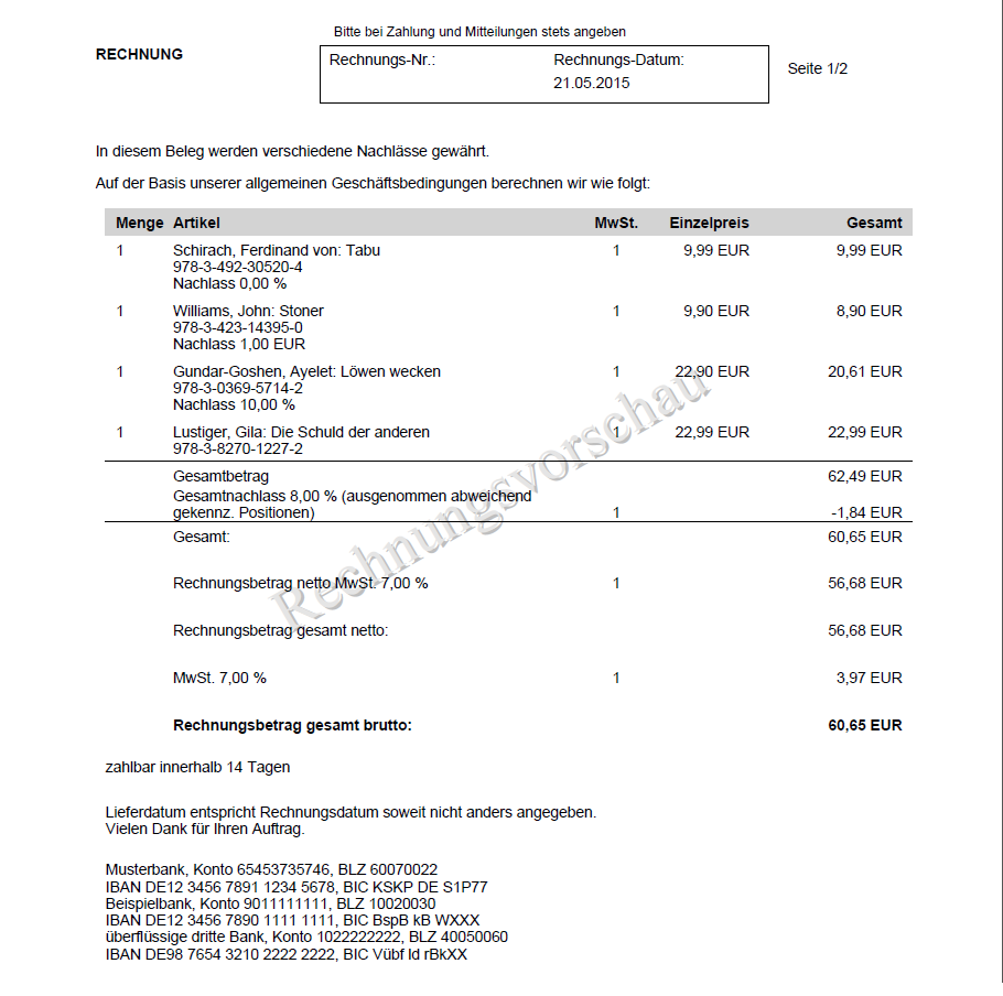 Das PDF ist mit einem Wasserzeichen als "Rechnungs-" oder "Lieferscheinvorschau" gekennzeichnet. Ansonsten sieht die Vorschau (bis auf die fehlende Belegnummer) genau so aus, wie der endgültige Beleg auch aussehen würde. Sie sehen den in den Optionen eingegebenen Freitext oben, die eingegebenen Freitexte pro Position und den zusätzlichen Rechnungstext und können mit der Vorschau einen Probedruck erzeugen.