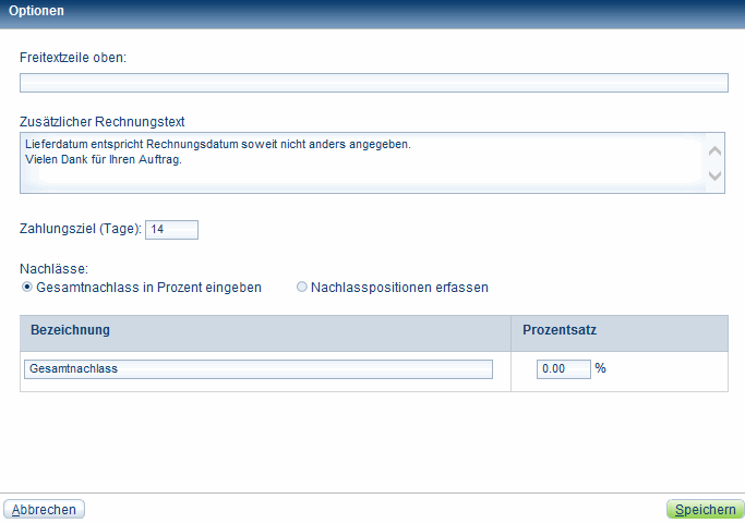 In den Optionen eines Beleges können Sie einen Freitext und einen zusätzlichen Rechnungstext eingeben, sowie die in den Stammadressen hinterlegten Einstellungen für das Zahlungsziel und den Rabatt überschreiben.