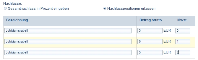 - Geben Sie ins Feld Bezeichnung eine Nachlassbezeichnung und ins Feld Betrag Brutto den Rabattbetrag in Euro ein.