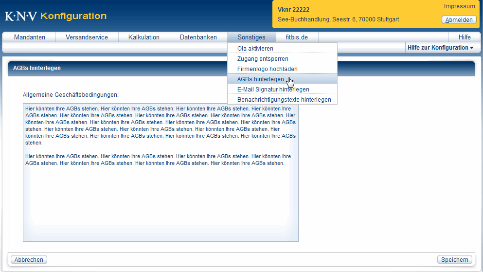 AGBs hinterlegenDa E-Books keine physischen Gegenstände sind, ist ihr Verkauf rechtlich diffizil. Tatsächlich werden lediglich Nutzungsrechte übertragen. Um sich rechtlich abzusichern, können Sie bei jedem E-Book-Verkauf dem Kunden einen Ausdruck Ihrer AGBs mitgeben. Diese können Sie zuvor in der Konfiguration hinterlegen.