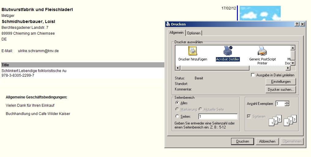 If the Country field of the customer's address is already filled with a valid ISO country code, e.g. DE, the customer's country of origin is already given in the Kundenland [Customer country] field (this field appears only with e-books), in this example Germany. When you save the order, the Allgemeine Geschäftsbedingungen [General terms and conditions] window opens automatically with your customer's address, the required e-book and your terms and conditions of delivery and use that you can print out and present to your customer. The order is added to the order book with the status E-Book entered. Once the customer has accepted the general terms and conditions, the customer can then pay for the e-book in advance at the checkout. |