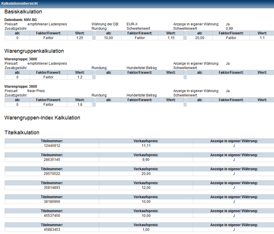 Diese Übersicht können Sie ausdrucken, um die Kalkulationsmodelle leichter zu überprüfen.