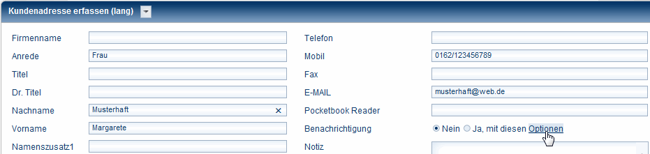 Tragen Sie dafür in der Kundenadresse eine Mobiltelefonnummer und/oder eine E-Mail-Adresse ein und klicken Sie bei Benachrichtigung auf Optionen.