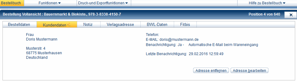 Eine E-Mail-Benachrichtigung wird mit der E-Mail-Adresse Ihrer Buchhandlung als Absender verschickt. Ihr Kunde kann Ihnen darauf antworten. Die Mailbenachrichtigung ist daher nur möglich, wenn Sie in der Konfiguration bei den Adressangaben Ihrer Buchhandlung eine Mail-Adresse angegeben haben.