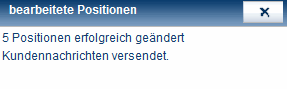 Automatische Kundenbenachrichtigung beim Wareneingang Wenn Sie für Ihre Kunden mit automatischer Benachrichtigung einen Wareneingang durchführen, werden Benachrichtigungen gemäß den in der Bestellung abgespeicherten Optionen und Kundendaten erstellt. Wenn beim Buchen eines Wareneingangs mehrere Positionen für denselben Kunden verarbeitet werden, so erhält dieser Kunde dafür nur eine Benachrichtigung. Sie erhalten nach dem Wareneingang eine Erfolgsmeldung:
