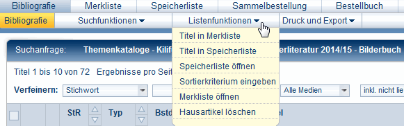 ListenfunktionenIn der Bibliografie stehen Ihnen mehrere Listenfunktionen zur Verfügung. Sie können damit einen oder mehrere markierte Titel in der Merkliste oder in einer Speicherliste abspeichern und Sie können diese Listen öffnen und damit weiterarbeiten.