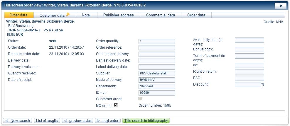 Changing orders in the order bookChanging individual order lineTo change an individual order line, click the required order line in the table in the order book. You can change the order data for the order line. Click Customer data or Note to make changes here. You can edit or add customer data as well as edit or enter a note for an order line. Click Save change to save the changes made in the order book. Click Publisher address or Commercial data to view this information for an order line. Changing several order linesTo change several order lines, you must first select the lines. For this purpose click the check boxes on the left in the table. Then select the order data you want to change in the order lines.