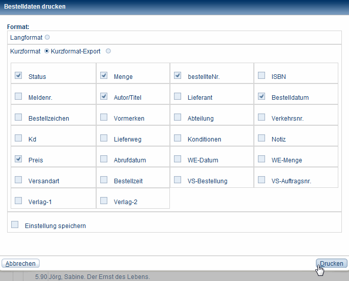 Auf dem Abholzettel erscheinen die Titelinformationen wie Autor, Titel, Verlag, Preis und die eingegebenen Kundendaten. Möchten Sie Ihr Firmenlogo auf dem Abholzettel ausdrucken, nehmen Sie die Einstellungen dafür im Konfigurationsprogramm vor. Gleichzeitig mit der Vorschau wird ein Druckdialog geöffnet, in dem Sie einen Drucker auswählen und den Druck starten können. Bestelldaten druckenDie Positionen des Bestellbuchs können Sie in Kurz- oder Langform ausdrucken.