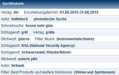 Wählen Sie in der Menüleiste unter Historie den Befehl Suchhistorie. Die letzten zehn Suchbegriffskombinationen werden aufgelistet.