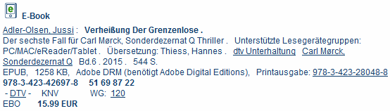Innerhalb der Vollanzeige eines Titels werden Ihnen im Bereich Übersicht Links zum Autor, zum Verlag, zu Schlagwörtern u. v. m. angeboten. Mit diesen Links können Sie innerhalb der Datenbanken weitersuchen. Nicht-lieferbare Artikel werden Ihnen mit Meldetext, Meldenummer und ggf. Erscheinungstermin angezeigt.