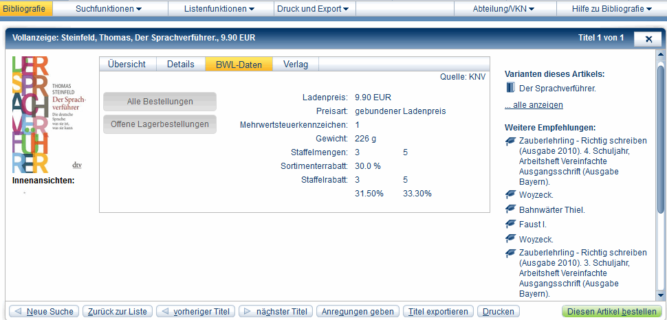 Es werden Ihnen der Lagerbestand bei KNV (bis 99 Expl.), der Ladenpreis, ggf. Sonderpreise wie Subskriptionspreis, die Preisart, das Mehrwertsteuerkennzeichen und das Gewicht angezeigt.