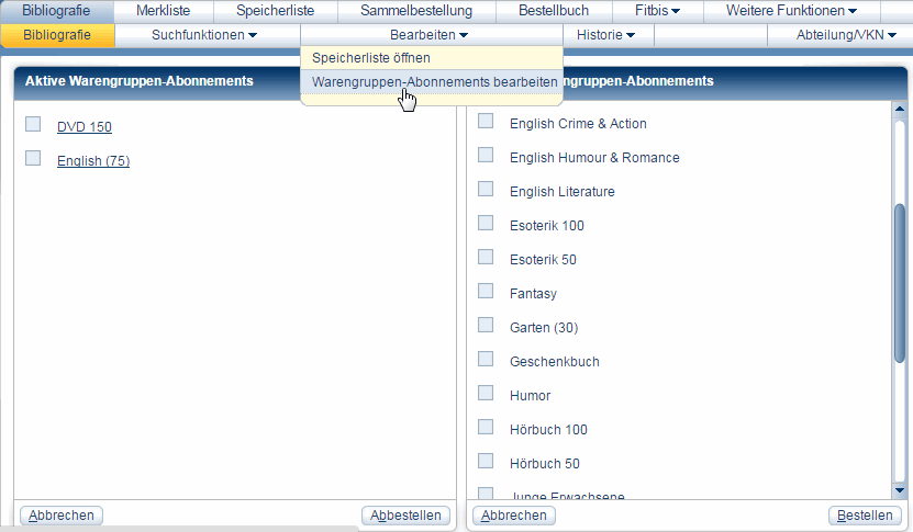 • Markieren Sie auf der rechten Seite eines oder mehrere Warengruppenabos und klicken Sie auf Bestellen.