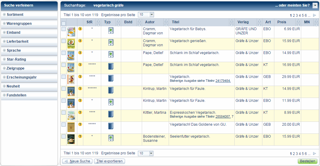 Die Spalte StR zeigt die Anzahl der Sterne innerhalb des Star Ratings an. Die Anzahl gelber Sterne entspricht der Gängigkeit eines Artikels nach Bezugszahlen oder, bei neu aufgenommen Titeln, nach der Einschätzung des KNV-Einkaufs und der bereits vorgemerkten Bestellungen.