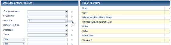 Searching addressesIn Additional features, Regular addresses you can search for customer address. For this purpose there are the Company name, First name, Surname, Street / P.O. Box, Postcode and Town search fields as well as two variable fieldsin the search dialog box. Type a search term or the start of a search term in one of the fields. Click Display or press the Enter key. Using the indexYou can also use the index to search for addresses. Type the start of a search term in the field. Click the triangle beside the field.