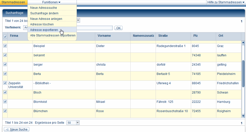 - Markieren Sie anschließend die gewünschten Adressen in der Trefferanzeige.