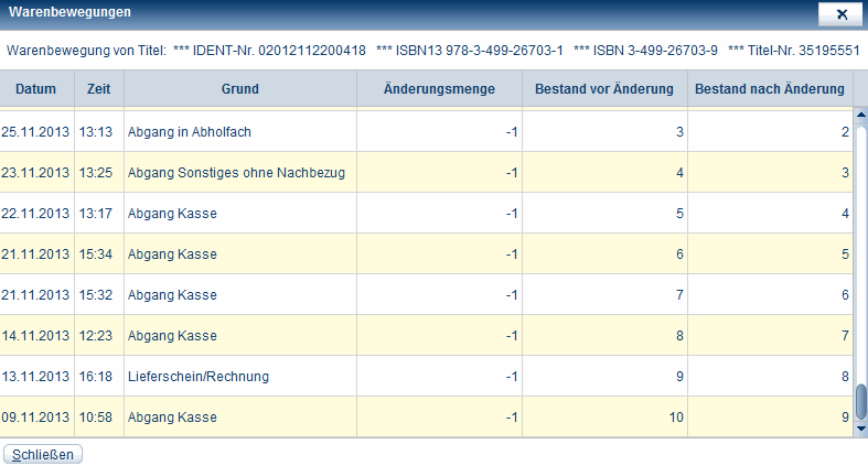 Jede Bestandsänderung durch Wareneingang, Abverkauf, manuelle Umbuchung, Lieferschein- / Rechnungsschreibung und Inventur wird protokolliert. Ebenso werden Kassenretouren und Rückbuchungen aus Lieferschein- und Rechnungsstorno angezeigt.