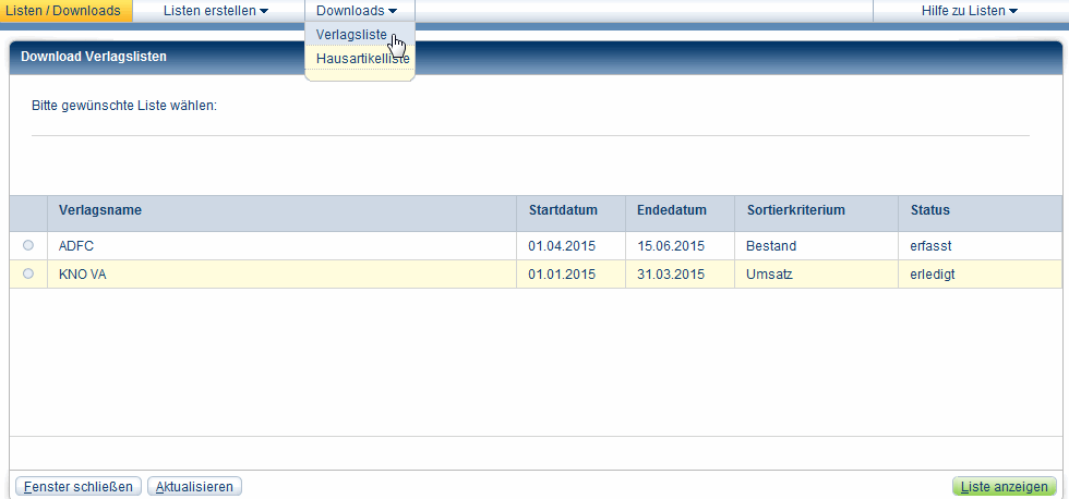 - Wählen Sie im Menü Download, ob Sie eine Verlagsliste oder eine Hausartikelliste öffnen wollen.