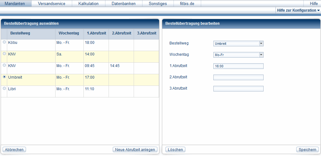 In fitbis.de haben Sie die Möglichkeit, bis zu drei Zeiten pro Lieferant für die Bestellübertragung einzugeben.