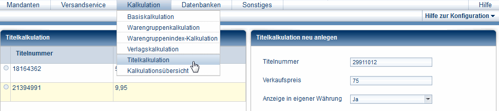Wenn Sie einen Titelpreis bearbeiten wollen, klicken Sie auf die Titelnummer. Wenn Sie einen neuen Preis für einen Titel anlegen wollen, klicken Sie auf Neu. In beiden Fällen können Sie im rechten Teil des Dialogs die Titelkalkulation bearbeiten.