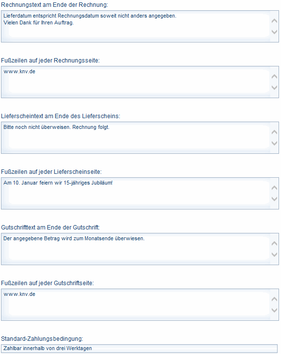 Ferner können Sie für Lieferscheine, Rechnungen und Gutschriften Standardtexte für die letzte Seite und für die Fußzeile jeder Seite eingeben. Und zuletzt können Sie auch eine Standard-Zahlungsbedingung angeben, die immer herangezogen wird, wenn keine individuelle Zahlungsbedingung aus den Belegoptionen oder den Stammadressen vorliegt. Wenn keine Zahlungsbedingung hinterlegt ist, erscheint auf der Rechnung: "Zahlbar sofort netto Kasse."