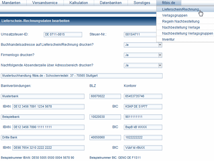 Konfiguration von Lieferscheinen und RechnungenAllgemeine Angaben für den Lieferschein- /Rechnungsdruck sowie für Gutschriften können Sie im Konfigurationsprogramm im Menü unter fitbis.de für Ihre Buchhandlung anlegen.