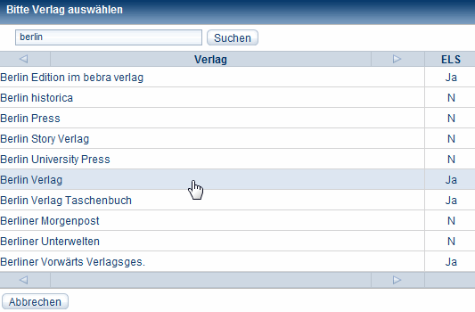 - Klicken Sie auf Verlag hinzufügen und geben Sie in der folgenden Suchmaske den Anfang des Verlagsnamens ein.