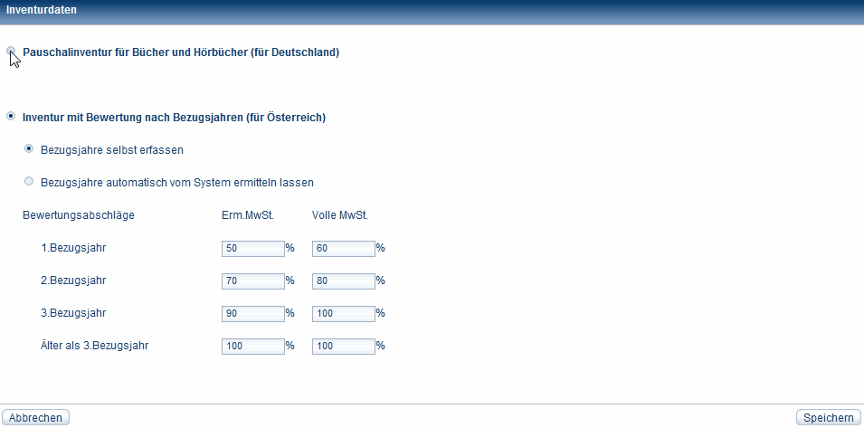 Daten zur Inventur-Bewertung festlegenIhre Inventur führen Sie in Deutschland mit der Bewertungsmethode Pauschalbewertung durch, in Österreich mit Bewertung nach Bezugsjahren. Die für Sie gültigen Abschlagsätze erfahren Sie beim Börsenverein oder über Ihren Steuerberater.