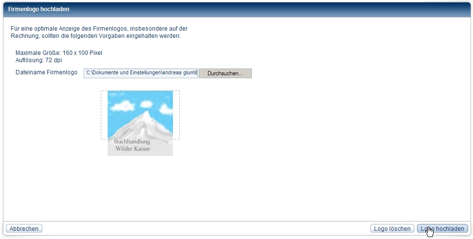 Uploading company logoTo print your company logo on literature lists, order slips and in fitbis.de on documents such as delivery invoices or invoices, you must first upload the logo and in this way save it in the configuration. Possible data formats for your logo are JPEG (file extension .jpg), bit map (.bmp), gif (.gif) or tiff (.tif). The maximum file size is 50 KB.