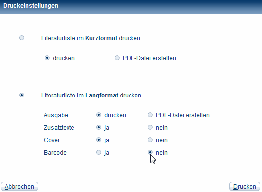 Sowohl beim Kurz-, als auch beim Langformat können Sie wählen, ob die Literaturliste gedruckt oder als PDF-Datei ausgegeben werden soll.