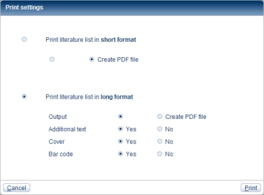 With both the short format and the long format you can select whether the literature list is to be printed or output as a PDF file.