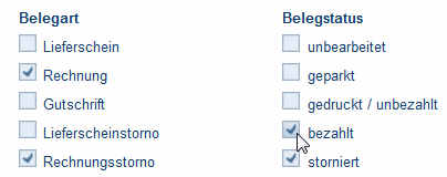 Über die Auswahlliste des Feldes Belegstatus können Sie gezielt nach Belegen mit einem bestimmten Bearbeitungsstand suchen (unbearbeitet, geparkt, gedruckt, bezahlt oder storniert). Wählen Sie einen oder mehrere Belegstatus aus, indem Sie diese anklicken.
