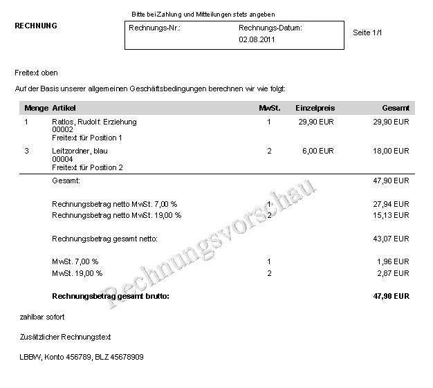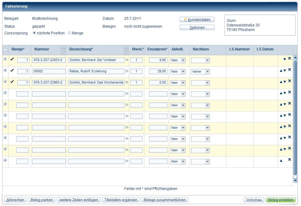Ihre Eingabe in der Freitextzeile oben erscheint in der Vorschau und beim Druck am Anfang der Rechnung.