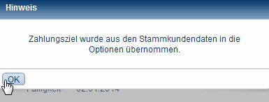 Haben Sie in der Stammadresse ein Zahlungsziel eingetragen, so erscheint beim Erstellen jeder neuen Rechnung für diesen Kunden ein Hinweis, den Sie mit OK bestätigen müssen.