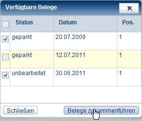- Markieren Sie einen oder mehrere der angezeigten Belege und klicken Sie auf Belege zusammenführen.