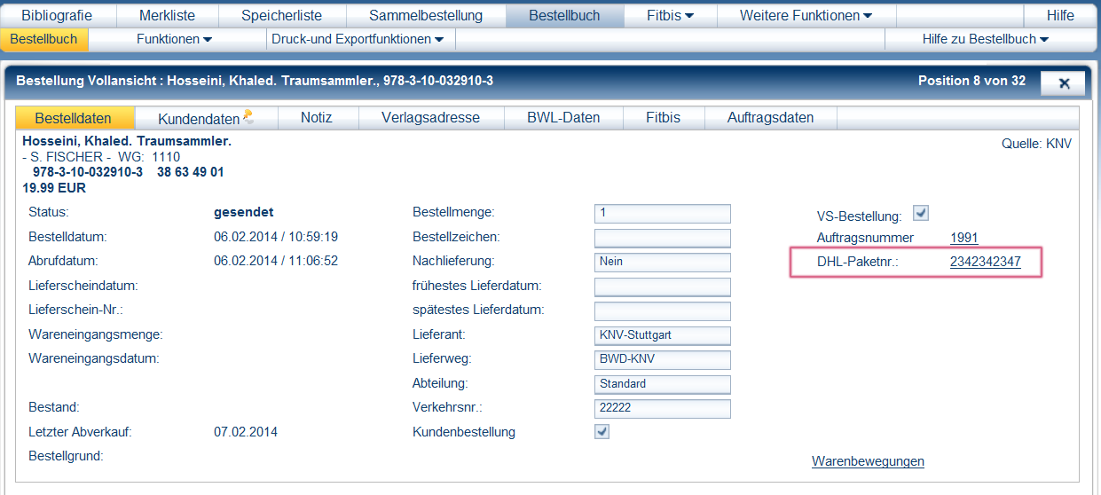 DHL-SendungsverfolgungIn der Vollanzeige des Bestellbuchs sehen Sie bei Ihren Versandservice-Bestellungen die DHL Paketnummer als Link.