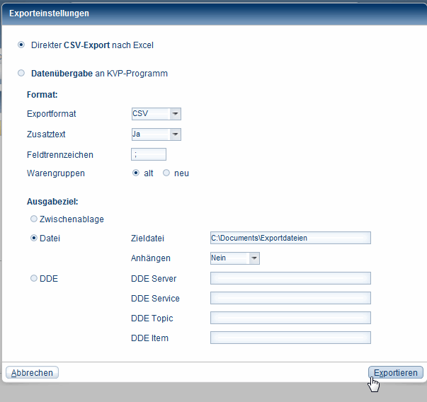 Wählen Sie anschließend das Format, ob Sie Zusatztexte mit exportieren möchten, das Feldtrennzeichen zwischen den Daten und, ob nach alter oder neuer Warengruppensystematik exportiert werden soll.