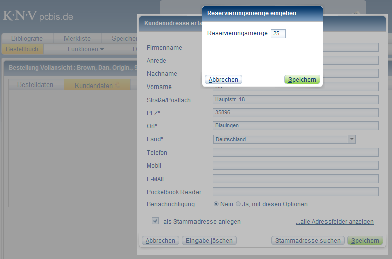 Es erscheint die Abfrage Reservierungsmenge eingeben. Vorgeblendet ist die komplette Menge der Lagerbestellung. Diese Abfrage entfällt, wenn nur ein Exemplar für das Lager bestellt war.