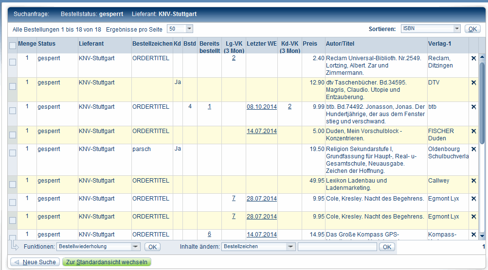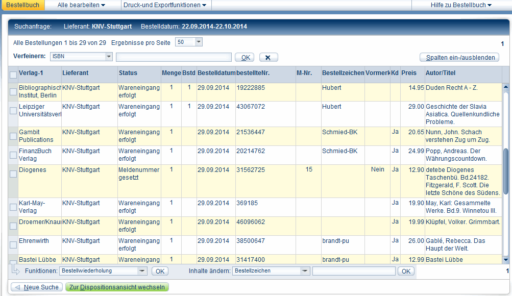 Positionen im BestellbuchDie bei einer Bestellbuchsuche gefundenen Positionen werden Ihnen in der Positionsanzeige des Bestellbuchs angezeigt. Sie können die Ansicht dieser Liste ändern, indem Sie Tabellenspalten hinzufügen oder entfernen oder deren Reihenfolge verändern (siehe Ansicht ändern). Sie können die Liste umsortieren oder filtern. Sie können sich für einzelne oder mehrere Positionen verschiedene Informationen anzeigen lassen und Änderungen durchführen. Je nachdem, ob die Positionen im Bestellbuch beispielsweise erfasst, schon gesendet oder schon eingegangen sind, haben diese unterschiedliche Bestellstatus. Abhängig vom Bestellstatus der Positionen können Sie deren Daten ändern (siehe Bestellungen verarbeiten). Zur Bearbeitung der fitbis.de-Ordertitel gibt die Dispositionsansicht. Klicken Sie auf zur Dispositionsansicht wechseln. Die Spalten in dieser Ansicht sind fest definiert und enthalten neue bzw. zusammengefasste Informationen, welche das Bearbeiten der Ordertitel vereinfachen: Bereits bestellt = Anzahl offener LAGER-Bestell-Exemplare (nicht Positionen!)., d.h. Menge der Bestellungen dieses Artikels mit Status gesendet, Lieferung angekündigt oder Meldenummer gesetzt. Die angezeigte Menge verlinkt auf die Offenen Lagerbestellungen im Bestellbuch Lg-Vk (3 Mon) = Anzahl aus dem Lager abverkaufter Exemplare innerhalb der letzten 3 Monate. Die angezeigte Menge verlinkt zu den Warenbewegungen, welche hier auch begrenzt auf die letzten 3 Monaten dargestellt werden. Letzter WE = Datum des letzten Wareneingangs, der Link führt zu den Warenbewegungen. Kd-Vk (3 Mon) = Anzahl der Exemplare aller Kundenbestellungen innerhalb der letzten 3 Monate. Der Link führt zu den entsprechenden Bestellpositionen. Über das X in der Löschen-Spalte am Ende der Zeile kann die Bestellposition sofort ohne Markieren und Bestätigen gelöscht werden. Mit dem Button Zur Standardansicht wechseln kommen Sie wieder zurück in die Standardansicht des Bestellbuchs. Weiterführende Themen: |