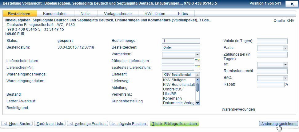 - Klicken Sie auf Verlagsadresse oder BWL-Daten, um diese Informationen zu einer Bestellposition einzusehen.