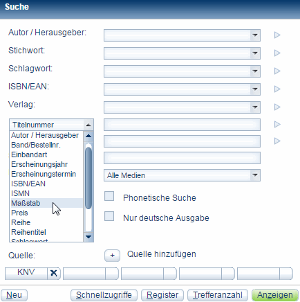 Nutzen Sie die diese Felder, um sich zwei Eingabefelder mit in Ihrer Buchhandlung häufig verwendeten Suchkategorien einzustellen.