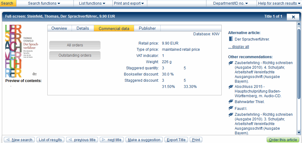 The number of copies in KNV stock, retail price , any special prices such as the subscription price, the type of price, the VAT indicator and the weight are displayed.
