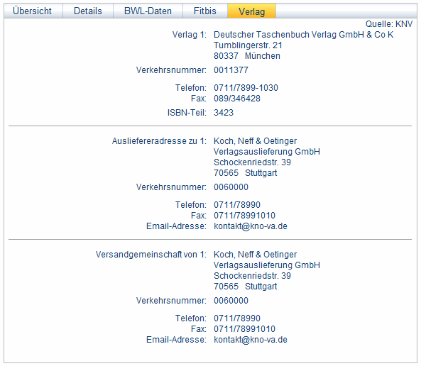 Gehört ein Verlag zu einer Verlagsgruppe, Versand-, Faktur- oder Novitätengemeinschaft, so wird dies in der Verlagsansicht der Titelanzeige angezeigt. Die Anzeige der Versand- und Fakturgemeinschaften verschafft Ihnen einen schnellen Überblick darüber, welche Verlage eine kostengünstigere und prozessoptimierende Bündelung anbieten. Wenn der Verlag zu einer Verlagsgruppe gehört, finden Sie über den Link vom Namen der Verlagsgruppe die Liste der dazugehörigen Verlage. Sind von der Verlagsanschrift abweichende Bestell- oder Remittendenadressen bekannt, werden sie ebenfalls angezeigt.