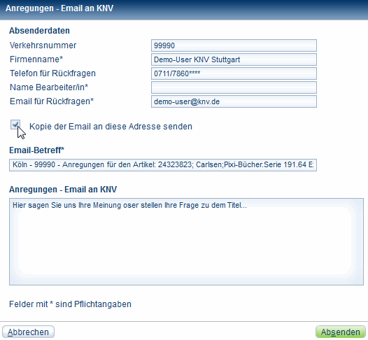 Ein Email-Formular mit Ihren Buchhandlungsdaten und Betreff wird geöffnet und muss nur noch um den Bearbeiter und die Anregung zum Titel ergänzt werden.